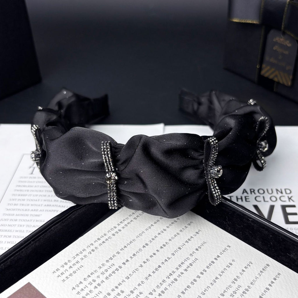 Black Satin Hair Band with Ruffled Bow and Bubble Detail for Women