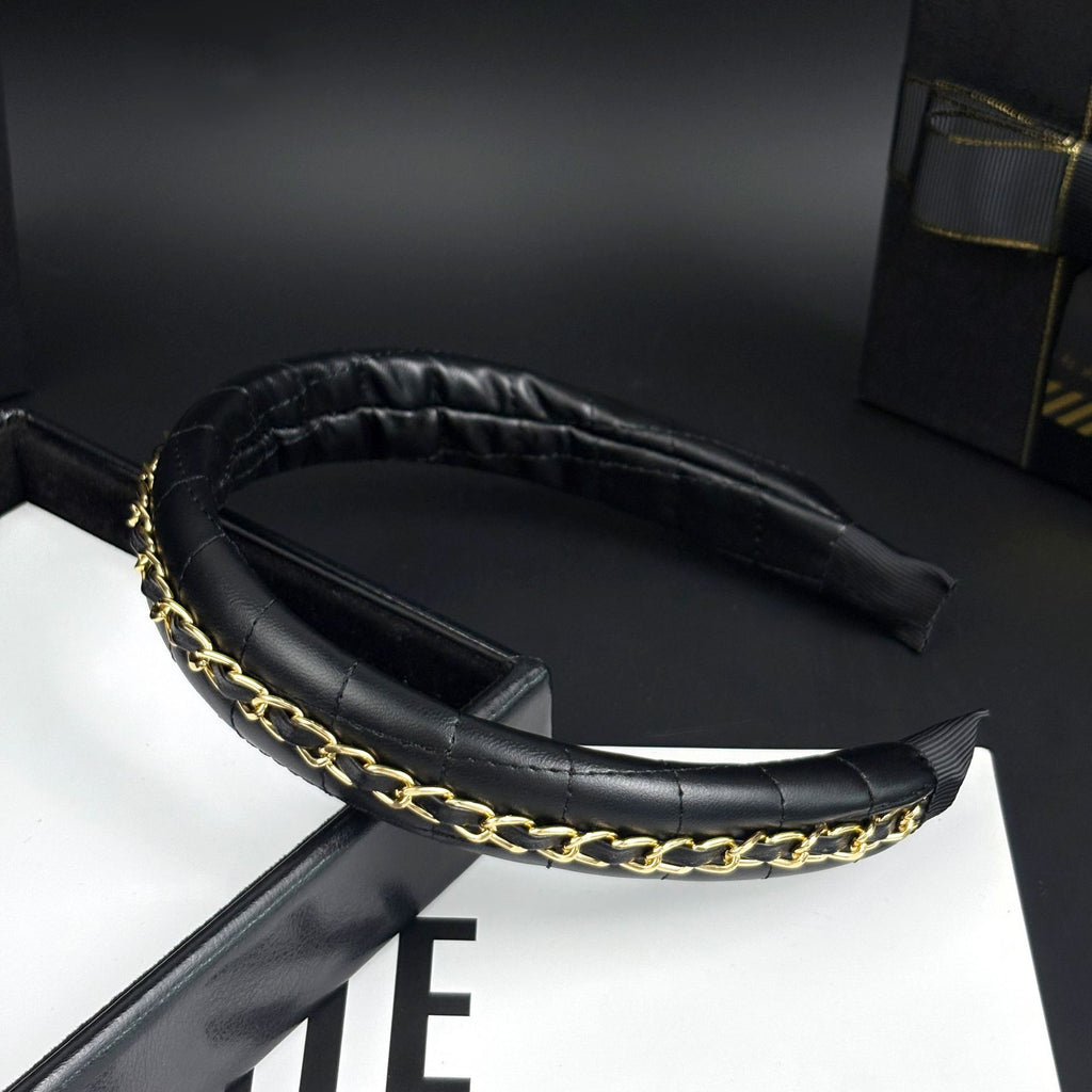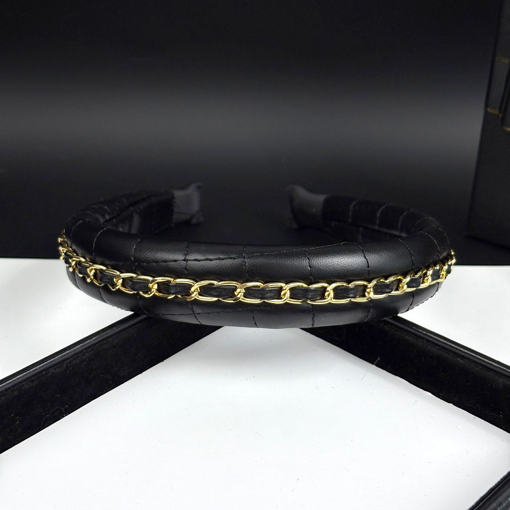 - Rich black leather base with finely detailed metal chain embellishment